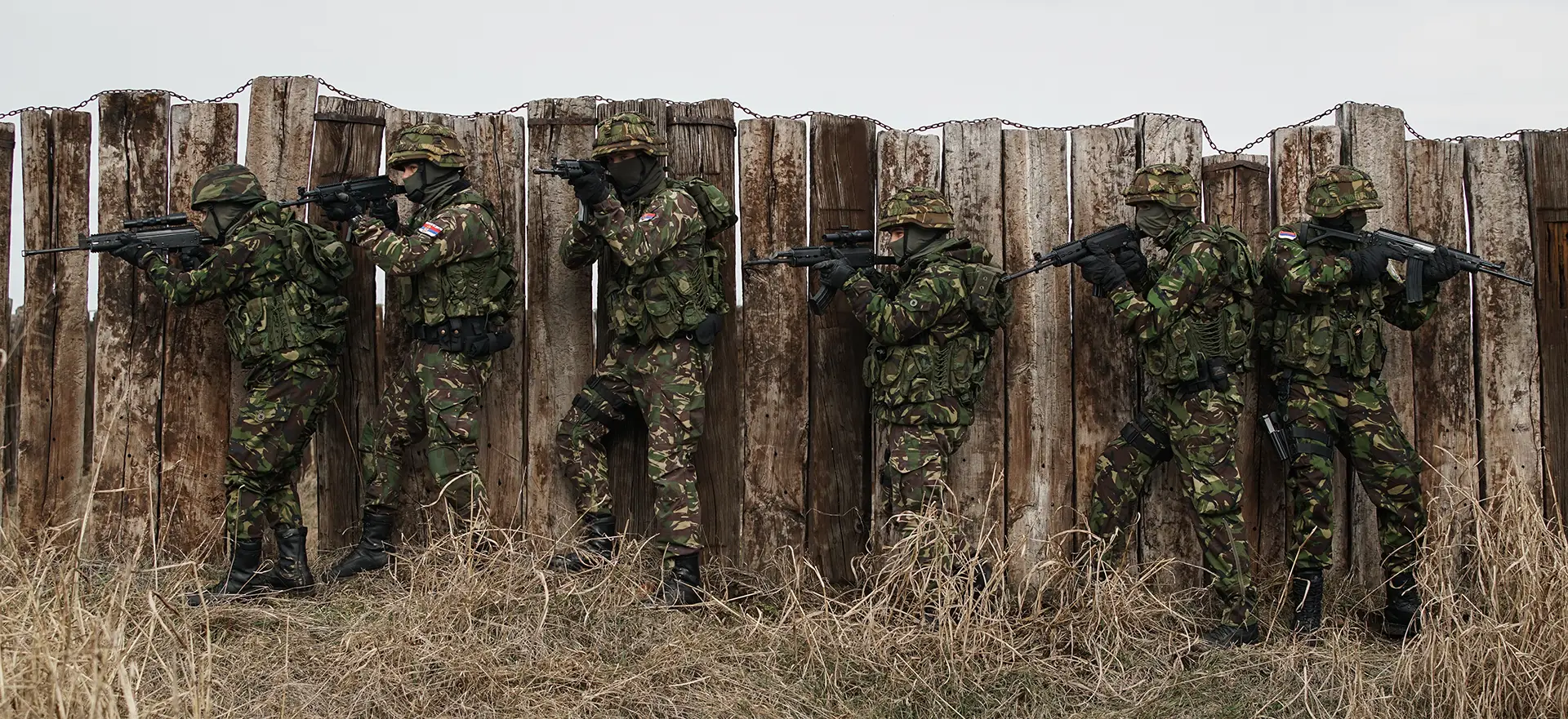 Две особе у маскирној униформи носе заставине Аутомате М05