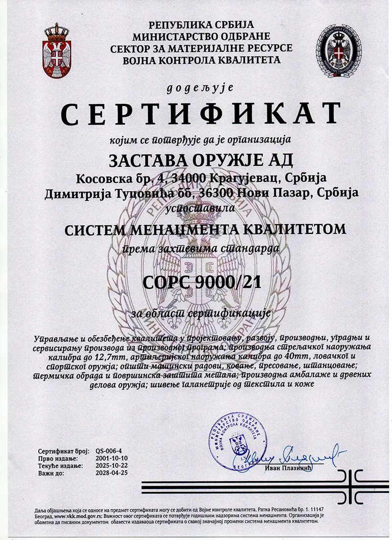 Систем квалитета у Застава оружје АД, први пут је сертификован 2001. године од стране Војне контроле квалитета и војне опреме, као сертификационог тела.