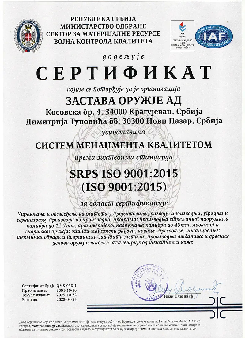 Тадашња сертификација се односила на систем квалитета у области обезбеђења квалитета у пројектовању, развоју, производњи, уградњи и сервисирању оружја, у Застава оружје АД и резултирала је: