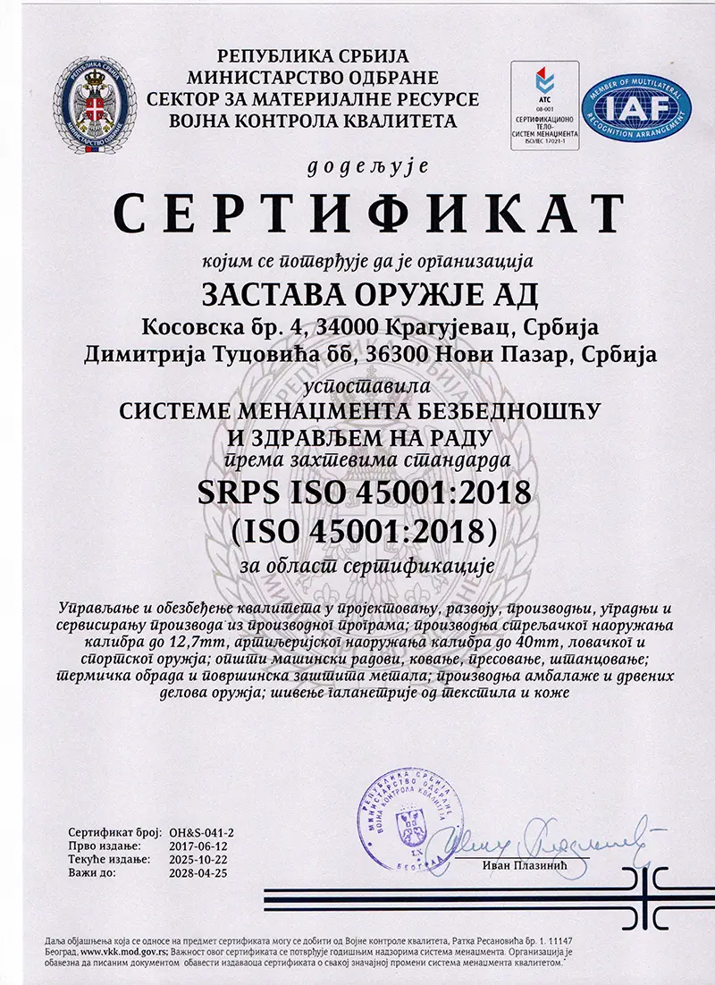 У месецу јуну 2017. године, Застава оружје АД је, поред сертификата стандарда система менаџмента квалитетом (СРПС ИСО 9001:2008 и СОРС 9000/14), стекла сертификате о усклађености са захтевима стандарда: